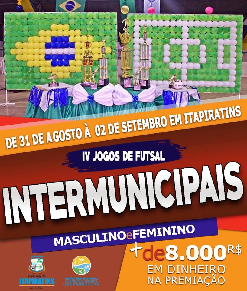 Atualizado em: 22/08/2018 09:46:09 Itapiratins realiza a IV edição dos jogos intermunicipaisEquipes de futsal masculino e feminino disputarão R$ 8 mil em premiação. Sendo, masculino: Campeão R$ 3.200 e Vice R$ 2.000. Feminino: Campeão R$ 2.200 e vice R$ 1.000.Por: Por Regilan Marinho Crédito da imagem: Divulgação