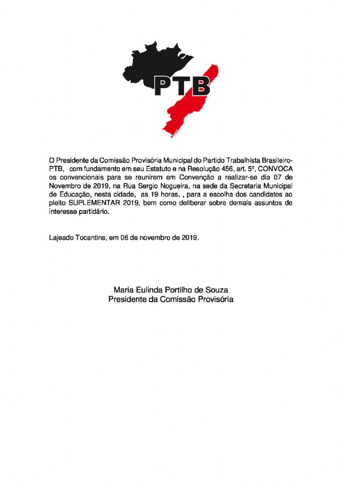 Atualizado em: 07/11/2019 18:05:25 Convocação PTB, Lajeado para Convenção MunicipalPor: Redação Crédito da imagem: Divulgação