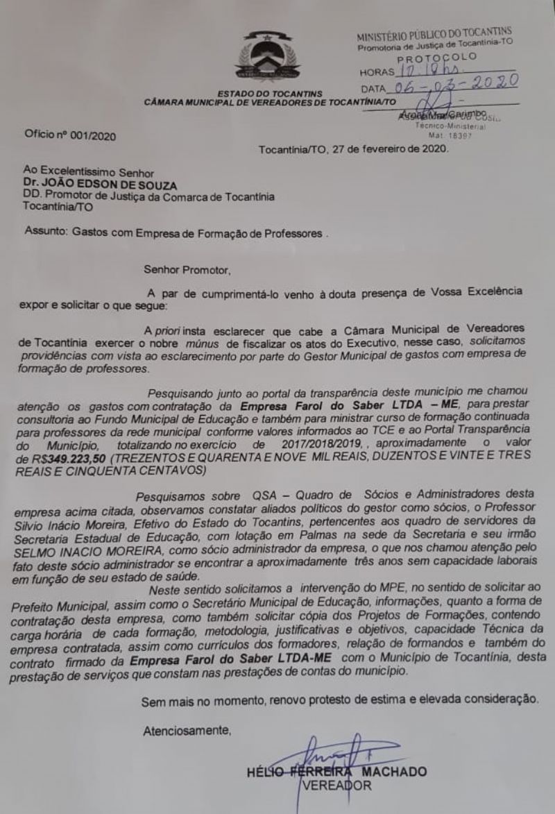 Atualizado em: 06/03/2020 18:01:28 Empresa de aliado do Prefeito de Tocantínia já faturou R$ 350 mil em contratos com a Secretaria Municipal de Educação; mas um caso curioso chama atençãoAs informações do faturamento são do portal da transparência do município. A denúncia foi protocolada pelo Vereador Hélio Machado ao MPE.Por: Por Regilan Marinho Crédito da imagem: Por Regilan Marinho