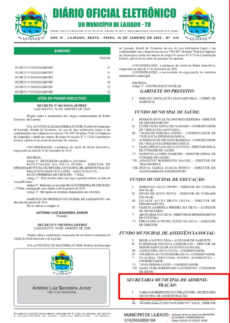 Bandeira nomeou o genro Carlos Roberto de Oliveira Junior, o “ super Kaká” em duas secretárias do município: