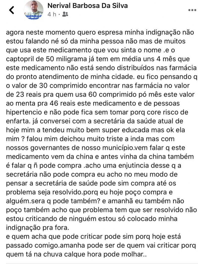Um morador de Lajeado, recorreu as redes sociais para manifestar sua indignação e o descaso com quem busca atendimentos básicos na Rede Municipal de Saúde. O jornal Poder Tocantinense, já havia noticiado problemas que a saúde municipal vem sofrendo nos últimos dias. Nerival Barbosa Da Silva, de 43 anos, e morador de Lajeado é hipertenso e precisa diariamente de remédios para controlar a pressão. Esse remédio deveria ser distribuído gratuitamente pela Secretaria Municipal de Saúde aos pacientes, no entanto há quatro meses, segundo Nerival relata em seu desabafo, está tendo que comprar o captopril 50 mg e indignado protestou nas redes sociais. O morador sensibilizou alguns amigos que se prontificaram a ajudar na compra dos medicamentos. ![]() ![]() ![]() O jornal Poder Tocantinense conversou na manhã desta quinta-feira (26) com o paciente. O mesmo informou, que sabe da existência de mais seis pacientes que necessitam do medicamento. Nerival relatou ainda, que ficou incomodado com a justificativa dada pela Secretária de Saúde, Jesiany Pajeú. Segundo ele a Secretária foi muito educada, mas deu uma desculpa “sem noção”. “Ela disse que o remédio vem da China” e deu a entender que, pelo fato dos problemas relacionados ao coronavírus no país, o medicamento não está disponível. Durante a conversa com nossa reportagem, o paciente recebeu uma ligação de outro paciente dizendo que o medicamento havia acabado de chegar na UBS Dona Felisbela e que era para ele ir buscar. Outras matérias sobre o assunto Paciente com alguns dos sintomas do coronavírus não recebe atendimento em UBS de Lajeado Motivo seria a falta de médico na Unidade de Saúde. Outro paciente que buscou atendimento por outro problema de saúde, foi orientado a buscar atendimento em Miracema. Esposa do líder do Prefeito e vice-presidente da Câmara de Lajeado é nomeada Secretária de Saúde prestes a dar luz Jesyane Pajeú deverá ficar poucos dias à frente do cargo, pois terá de deixá-lo para cumprir a licença maternidade. O que mais chama atenção é que Jesiany foi nomeada para substituir outra secretária empossada há poucos dias também grávida que já se licenciou. O outro Lado A reportagem entrou em contato com a Secretaria Municipal de Saúde por meio de e-mail e via celular da própria secretaria Jesyane Pajeú, para debater a situação, porém não obteve resposta até o fechamento desta edição. O espaço continua em aberto. |