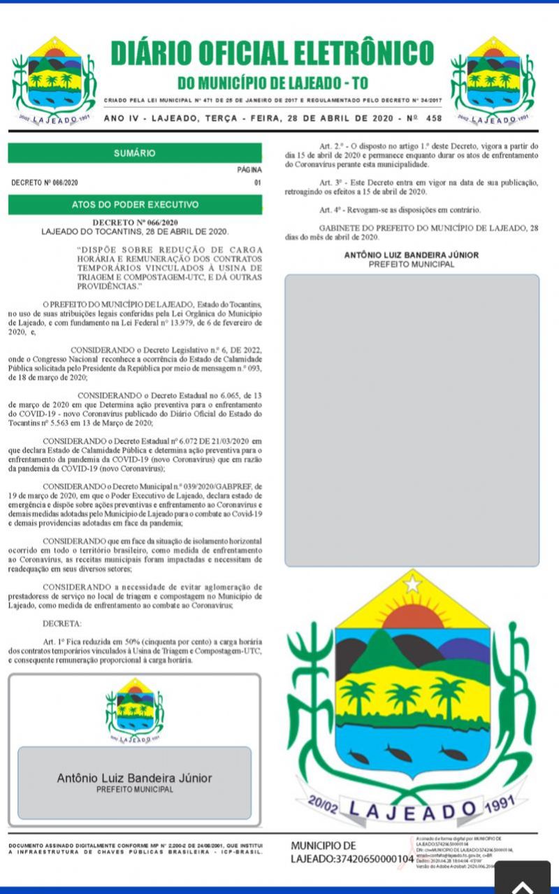A Prefeitura Municipal de Lajeado, publicou na noite desta terça-feira (28) no diário oficial do município redução de 50% dos salários de servidores da Unidade de Tratamento e Compostagem (UTC). A redução é retroativa a 15/04. Com o novo Decreto assinado pelo Prefeito Jr. Bandeira os trabalhadores que ganham R$ 1.045 mensais passam a ganhar R$ 522,50 – 7, 5%, R$ 483,31 líquidos. E ainda de acordo com o Decreto, os trabalhadores que realizaram suas atividades até a presente data, descobriram somente hoje (28) que receberão apenas pela metade do serviço. Desde que assumiu o município em dez/2019 o atual gestor vem tirando e atrasando constantemente os salários dos servidores do município. Saúde, Educação e agora os servidores da UTC vem passando por dificuldades com as perdas dos ganhos. Diário oficial desta terça-feira (28) ![]() Espaço aos citados |