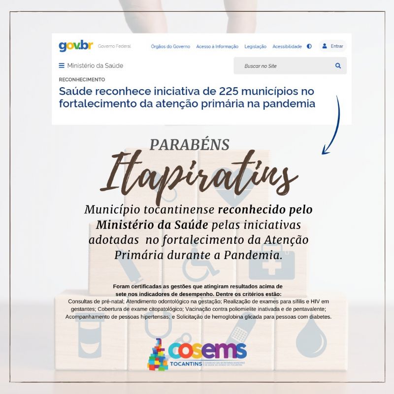 Atualizado em: 06/07/2021 14:48:43 Itapiratins conquista selo de Qualidade da Atenção Primária à SaúdeO Ministério da Saúde reconheceu as ações de 225 municípios brasileiros no combate da Covid-19, no Tocantins 12 municípios foram comtemplados.Por: Por Regilan Marinho Crédito da imagem: Divulgação
