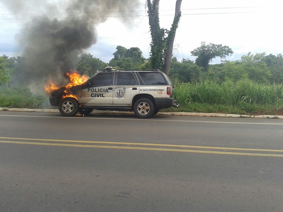 Carro da Polícia Civil pega fogo na BR 010 entre Porto Franco e Estreito